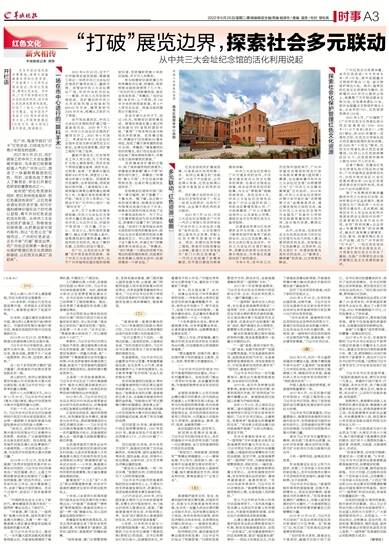 交通客流资源与红色资源的合作与对接,让党史学习教育和城市形象有了新的结合点,也让红色故事,融入到大众的日常生活当中。中共三大会址纪念馆打破边界,把静态的参观与动态的展示相结合,为传承红色基因找到了新的落点。