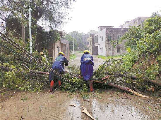 茂名电白一处电线杆和线路被树木压断倒在路面,供电人员紧急抢修 金俊雄 摄