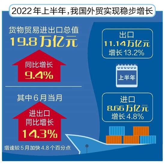 据海关统计,今年上半年我国货物贸易进出口总值19.8万亿元人民币,同比增长9.4%。其中,出口11.14万亿元,增长13.2%;进口8.66万亿元,增长4.8%。其中6月当月,进出口同比增长14.3%,增速较5月加快4.8个百分点。
