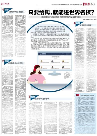 近年来,“保录取”广告在各大社交媒体屡见不鲜。有留学生在网上吐槽:不少留学机构都会暗中推销所谓的“保录取”项目,号称花钱就能金榜题名。留学“保录取”究竟是何方神圣?整个产业链又是如何一步步运作而成?记者经多方采访,起底部分留学机构的“保录取”真相。