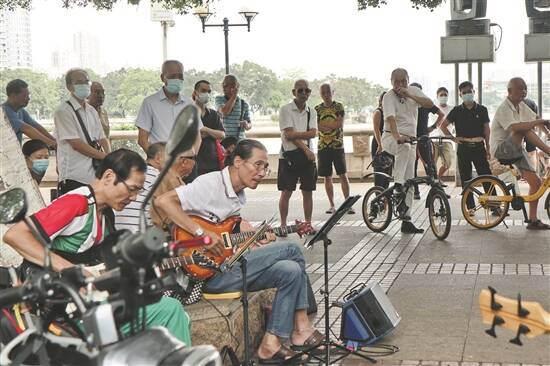 虽说不重名利,但声韵乐队也有些名声。几年前,有路人将他们的演出拍下并放到网上,称赞其为“广州街头水平最高的乐队”。网友纷纷点赞,有留言称:“感觉心里特别温暖,整个人都慢下来。”“在一旁观看的不止是老人们,也有很多年轻人,每首歌唱完,大家一起为他们鼓掌的时候,真的让我感觉被广州这座城市感染了。”