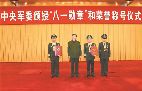 八一大楼仪式现场,部队官兵和文职人员代表整齐列队,气氛庄重热烈。下午4时,18名持枪礼兵正步入场、伫立两侧,颁授仪式开始,全场高唱国歌。中共中央政治局委员、中央军委副主席许其亮宣读习近平签署的中央军委授予“八一勋章”和荣誉称号的命令,中共中央政治局委员、中央军委副主席张又侠主持仪式。