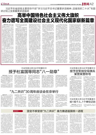 7月26日,“九二共识”30周年座谈会在人民大会堂举行。在当前两岸关系复杂严峻的形势下,在各界为台海局势紧张动荡深感忧心之际,这次座谈会的召开释放了鲜明的反“独”促统政策信号,充分展现大陆方面坚持“九二共识”、维护台海和平稳定、捍卫国家主权和领土完整、推进祖国统一进程的信心和信念。正本清源、激浊扬清。回顾和阐释“九二共识”的历史经纬和重大意义,有助于巩固两岸关系和平发展的思想基础,引导两岸同胞特别是台湾同胞更深刻体认坚持“九二共识”的重大价值,团结两岸中华儿女为实现祖国完全统一和中华民族伟大复兴共同奋斗。