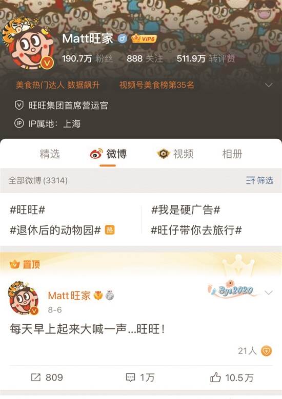 随后,“Matt旺家”账号的持有人为旺旺集团创始人蔡衍明次子蔡旺家这一消息也被网友挖出。蔡旺家此前在微博发布的一系列或emo、或摆烂的总裁日常,也随之为网友津津乐道。其每天早上八点微博大喊一声“旺旺”,更是激起了不少人的童年回忆。