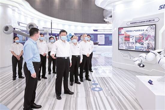 习近平17日在沈阳市考察调研。当天下午,他来到沈阳新松机器人自动化股份有限公司。在企业展厅,习近平听取辽宁新时代东北振兴整体情况介绍,察看辽宁先进科技产品集中展示,并考察了新松公司生产经营、自主创新情况。企业生产车间内,工业机器人、协作机器人、特种机器人等正在进行测试。习近平向技术人员和企业职工询问企业开展核心技术攻关等情况,对企业自主创新和产业化发展取得的成绩予以肯定,表示新松公司体现了中国速度、中国水平。