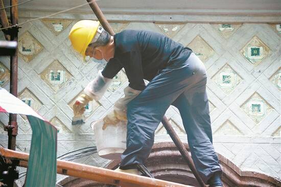 工人正在清理拱券表面的白色墙漆