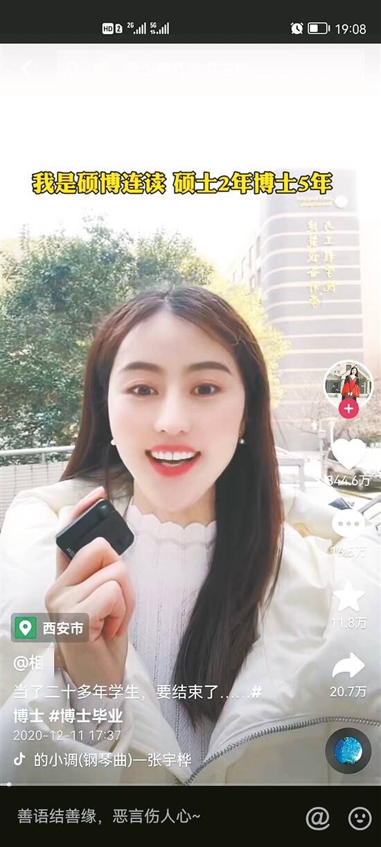 在这则视频中,张婷分享自己工科博士毕业,本科靠勤工俭学、助学贷款念书的故事。其姣好的面容、娓娓道来的叙述以及长久以来历史文化爱好者的形象,与人们对工科博士的刻板印象产生了巨大的反差,这让张婷迅速收获了340多万的点赞量。此后,不到一个月时间,账号“相某”的粉丝量从200多万飞涨到近1000万。
