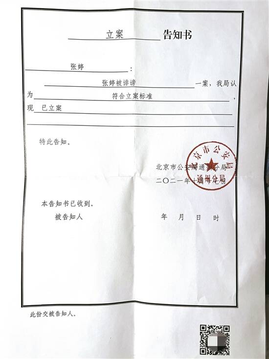2021年8月,不堪其扰的张婷以“被诽谤”为由向李雨禅居住地的公安机关报了警。次日,北京市公安局通州分局宋庄派出所出具受案回执,同年10月,通州分局正式立案。