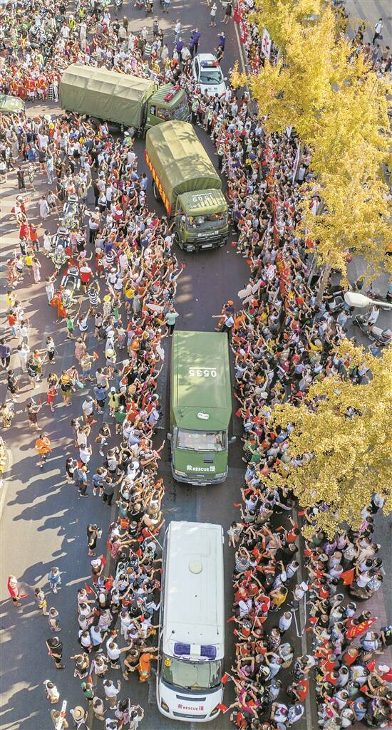 当日上午,消防指战员们在西南大学集结,然后乘车离开。大家夹道欢送这群可爱的人,车辆只能缓缓前行。大街上,重庆人民把路堵得几乎水泄不通,大家挥舞着国旗,竖着大拇指,齐声高喊“雄起!雄起!”。有人不停往车上塞东西,还有人追着车奔跑,消防员们敬礼、比心,回应着群众似火般的热情。有网友说:“这辈子第一次见到这么大的场面。”