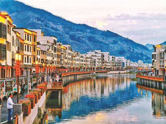 金碧辉煌的水景廊桥,双合桥下艺术微坝流水潺潺,桥上人来人往、欢声笑语