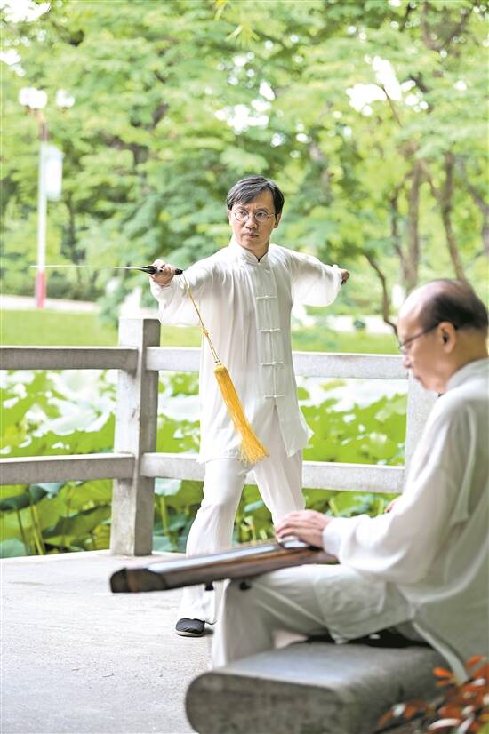 区君虹(右)、区宏山(左)父子切磋琴艺与剑术 唐伟峰/摄