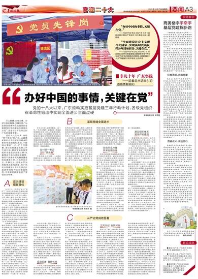 党的十八大以来,地处“两个前沿”的广东,认真落实新时代党的建设总要求和新时代党的组织路线,不断深化落实“1+1+9”工作部署,滚动实施基层党建三年行动计划,推动全省各级党组织全面进步全面过硬;认真落实中央八项规定精神,驰而不息推进党风廉政建设和反腐败斗争,力戒形式主义、官僚主义,全面从严治党取得历史性进展,为广东在全面建设社会主义现代化国家新征程中走在全国前列、创造新的辉煌提供了坚强政治保障。