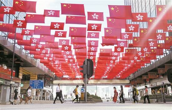 香港回归25周年之际,香港尖沙咀中心的街道上挂满五星红旗和香港特区区旗 羊城晚报记者 汤铭明 摄