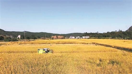 在南雄市水口镇,2.8万亩水稻逐渐进入收获季节。记者在当地农田里看到,一台台收割机在田间来回穿梭,将一串串饱满的稻穗卷入收割机中。一会儿工夫,装满稻谷的收割机回到田埂边,将稻谷转移至运输车上,省时省力又省心。