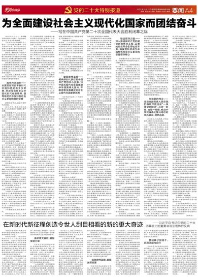 中国共产党第二十次全国代表大会10月22日在人民大会堂胜利闭幕。习近平总书记在闭幕会上发表重要讲话,号召全党紧密团结在党中央周围,高举中国特色社会主义伟大旗帜,坚定历史自信,增强历史主动,敢于斗争、敢于胜利,埋头苦干、锐意进取,团结带领全国各族人民为实现党的二十大确定的目标任务而奋斗。
