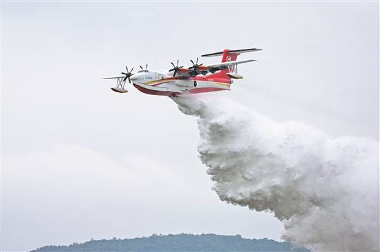 国产大型灭火/水上救援水陆两栖飞机AG600M进行飞行投水演示