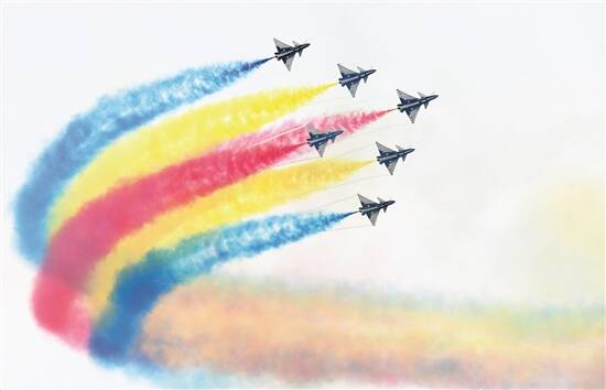 上午10时,飞机轰鸣声响起,空军八一飞行表演队的6架歼-10左至右驶过金湾机场上空。大仰角跃升、六机编队斤斗、六机同步横滚等动作,不仅精彩震撼,同时也具备很高的实战价值。