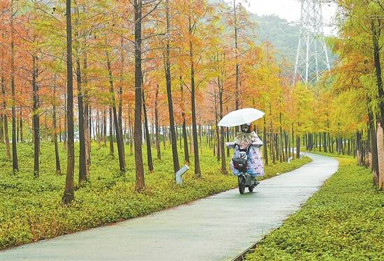 11月8日,广州天河大观湿地公园,落羽杉在“入秋”期间显露“秋色” 梁怿韬 摄