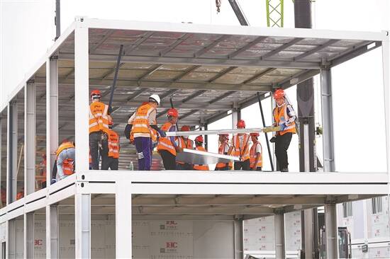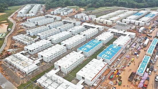 22日上午11时许,记者在现场看到,穿着各色工服的工人正争分夺秒、有条不紊地抓紧作业。目前,南沙健康驿站的隔离板房基本搭建完成,工人们正在完成室内水电及集装房淋浴设备安装。该项目建成后可提供约21870间隔离用房,共有8万多张隔离床位。