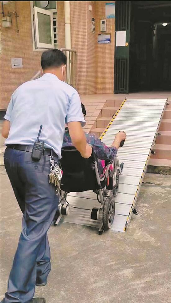 70岁的独居老人赖姨受脊髓炎之苦,30年来行动不便,近年来更是难以行走,要依靠轮椅出行。赖姨所住楼栋大门外有六级台阶,且难以改建无障碍通道,为此赖姨购置了一个便携式无障碍铝合金斜坡。为了不给别人添麻烦,她甚少下楼,平日买菜多是物业工作人员、邻居帮忙带上来。