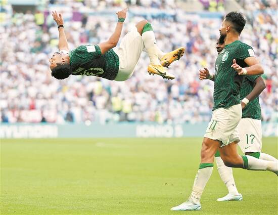 沙特阿拉伯队球员阿尔多萨里(左)在打入球队第二粒进球后空翻庆祝 新华社发