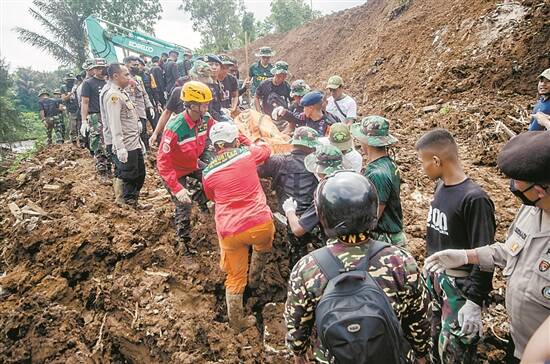 ◀22日,救援人员在震中附近的山体滑坡现场搬运遇难者遗体 新华社发