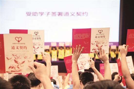 受助学子举起签署的《仲明大学生助学金道义契约》