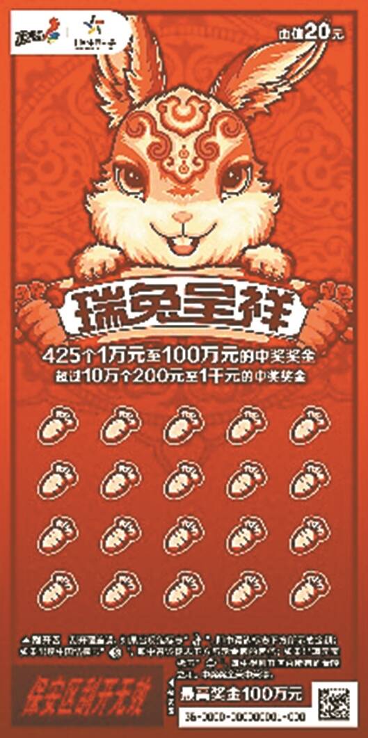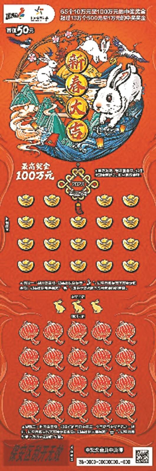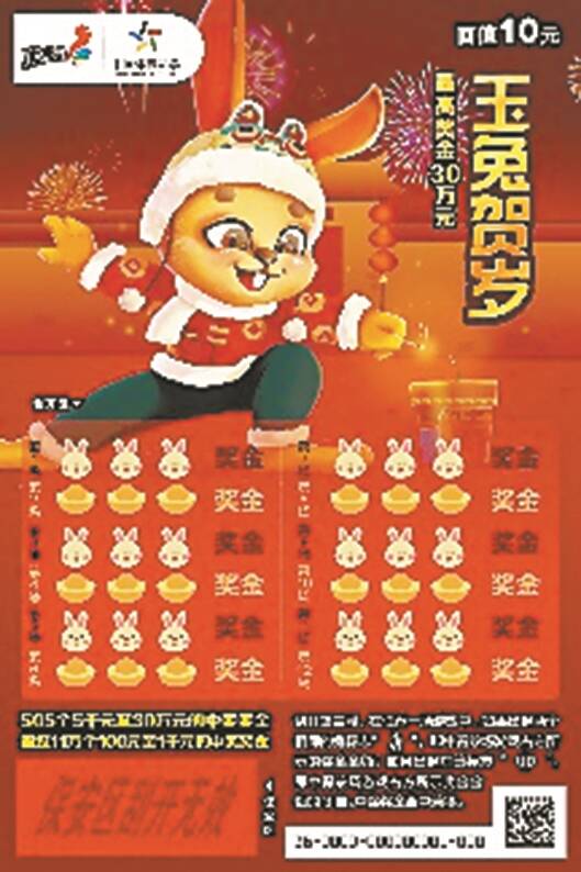 2022年12月22日至2023年1月18日,国家体彩中心开展惊喜活动“体彩新春季,瑞兔呈祥送好彩”,凡购买“卯兔”(5元)、“玉兔贺岁”(10元)、“瑞兔呈祥”(20元)、“新春大吉”(50元)、“红包来啦 让好事发生”(10元)5款新春主题系列票中任意1款,通过中国体育彩票APP或微信小程序扫描票面保安区二维码,登录活动页面就有机会获得5G手机、定制智能跳绳机、定制飞盘等精美礼品,共计32968份等你来领。