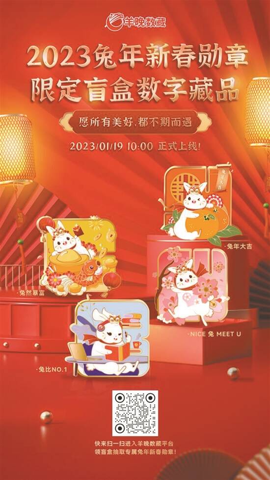 羊城晚报讯 记者孙磊、聂粤报道:春节临近,1月19日10时,羊晚数藏平台将上线《2023兔年新春勋章·限定盲盒》,此次上新的系列藏品包括“新春·兔年大吉”“新春·兔然暴富”“新春·NICE 兔 MEET U”“新春·兔比NO.1”4款原创藏品。