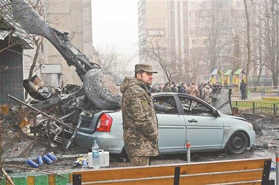 据新华社电 据乌克兰国际文传电讯社18日报道,一架直升机当天在基辅市东郊的布罗瓦雷坠毁,导致包括乌内务部长杰尼斯·莫纳斯特尔斯基在内的18人死亡。