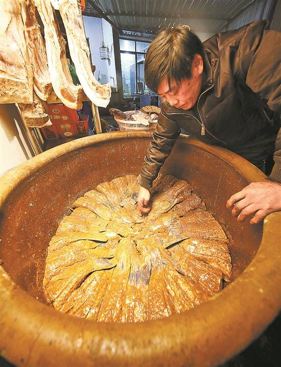 大部分的青鱼将被切成鱼段,最肥美的中段和尾巴是制作传统苏式糟鱼的上好食材,黄酒、盐、酒糟按一定配比调和起来,均匀地抹在鱼肉上,一口巨大的陶缸早就洗刷干净,抹上酒糟的青鱼段和鱼尾被仔细码放起来,一层一层,整齐有序。