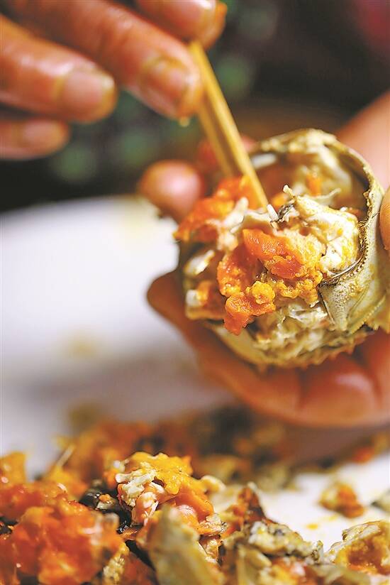 丰饶如苏州,要吃一口地道的秃黄油也不是件寻常事。蟹,得是不大不小的母蟹,膏多紧致。出水之后,赶紧趁着新鲜,蒸煮了。大火七分钟不能多了,蟹熟,红彤彤冒着腥腻的热气。四仰八叉地被倒在圆台面上,工具只有剪刀和竹签。蟹斗直接打开,用竹签挑出黄灿灿的蟹黄来,落在画着缠枝纹的青花大碗里,再“啪”的一下掰开蟹身,一大块油腻腻如田黄石般的蟹黄,赖在蟹肉上不肯下来。还有荔枝冻或象牙白,哦,那是一堆颤悠悠的,丰腴无比的蟹膏。