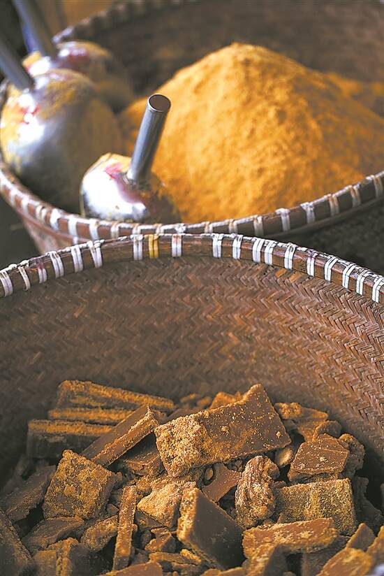 蔗渣并不会被浪费,晒干后就是非常好的熬糖燃料……作坊里很暖和,用爪篱子把泛起的糖沫捞尽。糖水熬制成黏稠的糖膏时,师傅们才把糖膏起锅,舀入木槽,用刀铲和木杵搅匀捣碎,再用丁字形的木糖锤顺着糖槽来回推压碾细成粉末。刚出锅的红糖是黏稠而热烈的流质,最适合手指头去粘一下,吮吸一口,那种丝丝入心的甜腻,居然有沙瓤的质感,摩擦着味蕾,既清冽又浓郁。