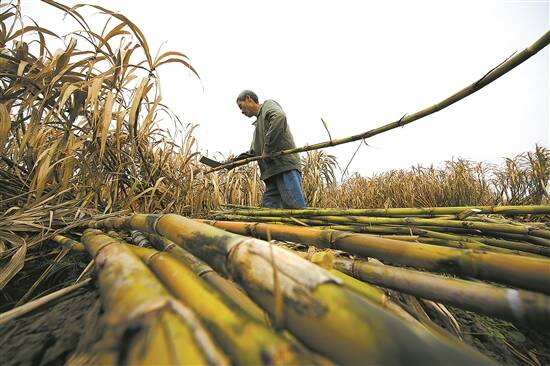 六十七岁的李福民在自家的甘蔗地里忙着收割最后一批甘蔗。刚下过雨,地里泥泞不堪。