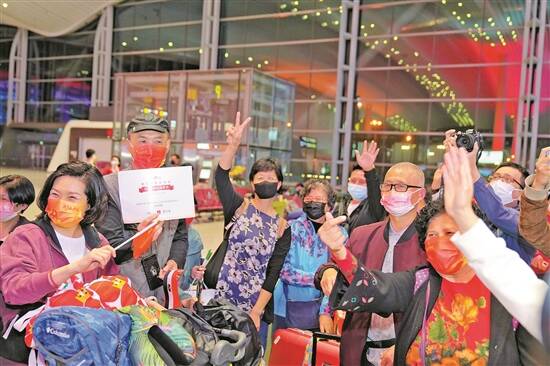 5日晚,出境游首团游客开心等待值机 羊城晚报记者 曾育文 刘颖颖 摄