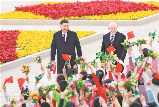 4月14日下午,国家主席习近平在北京人民大会堂同来华进行国事访问的巴西总统卢拉举行会谈。这是会谈前,习近平在人民大会堂东门外广场为卢拉举行欢迎仪式 新华社发