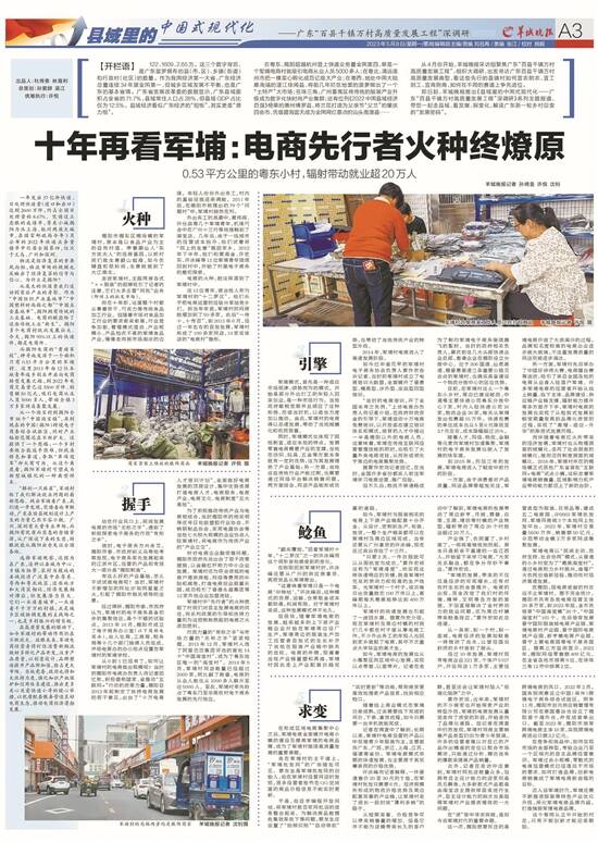 2014年,人口只有2695人但淘宝店却超过3000家的军埔村吸引了羊城晚报记者的注意,《揭阳军埔村一年变身“亿元电商村”淘宝店超3000家》报道出街时,军埔村电商月成交额1.36亿元。