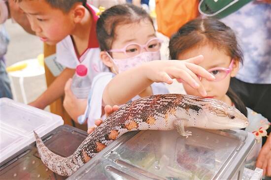 孩子们在科普嘉年华摊位与小蜥蜴互动