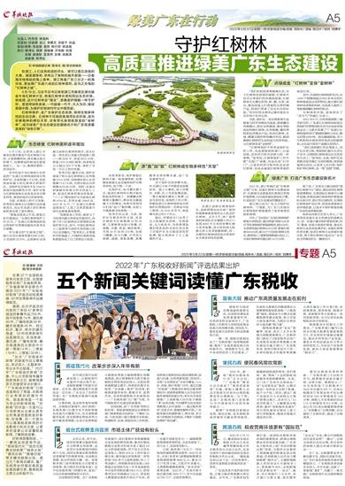 一篇一章,税收好新闻见证了广东税务部门发挥税收职能,服务广东高质量发展大局的新作为。围绕稳字当头、稳中求进的经济工作总要求,广东依托大数据应用精准落实大规模增值税留抵退税、“六税两费”减免、制造业中小微企业缓缴税费等惠企政策,助力市场主体快速纾困,为稳住宏观经济大盘贡献“税力量”。
