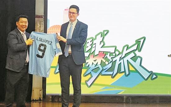 乌拉圭驻广州总领事馆代总领事法昆多·费尔南德斯·格拉(右)向广东实验中学校长全汉炎赠送乌拉圭队球衣 羊城晚报记者 谭铮 摄