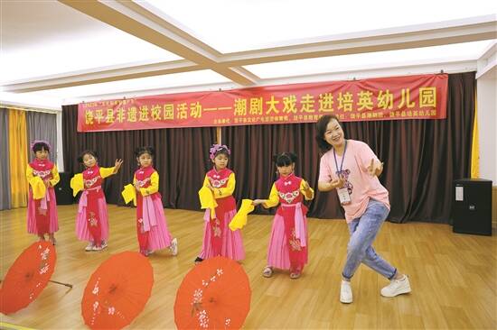 6月9日上午,伴随着节奏鲜明的音乐,饶平县师范实验小学的同学们将省级非遗项目“饶平布马舞”的文化元素融入到整齐划一的手势舞中,进行了一场精彩纷呈的展演。市级非遗传承人刘树钊还为学生们进行现场授课,讲解布马舞的历史由来、发展过程、特点等,让师生亲身感悟布马舞的魅力。
