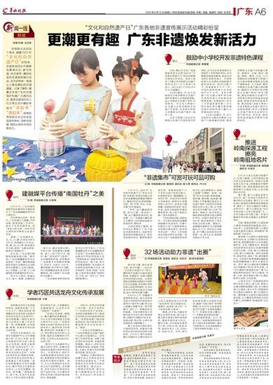 在刚刚过去的这个周末,随着2023年“文化和自然遗产日”的到来,全省各地同步开展群众喜闻乐见、参与性强、形式多样、精彩纷呈的非遗宣传展示活动,为市民带来一场场让人眼花缭乱的非遗盛宴。记者了解到,随着近年来广东对非遗保护和推广力度的加大,更多非遗项目在人们日常生活中精彩亮相并“活起来”“潮起来”,岭南优秀传统文化正在实现创造性转化、创新性发展,焕发出前所未有的新活力。