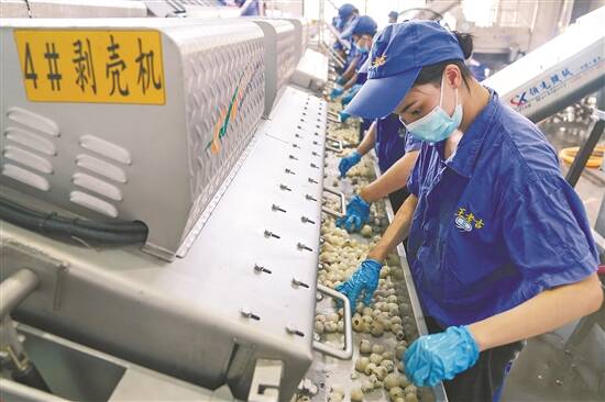 广药王老吉广东荔枝(茂名)产业园中的荔枝饮料生产线,工人们正处理经剥壳机去壳的荔枝