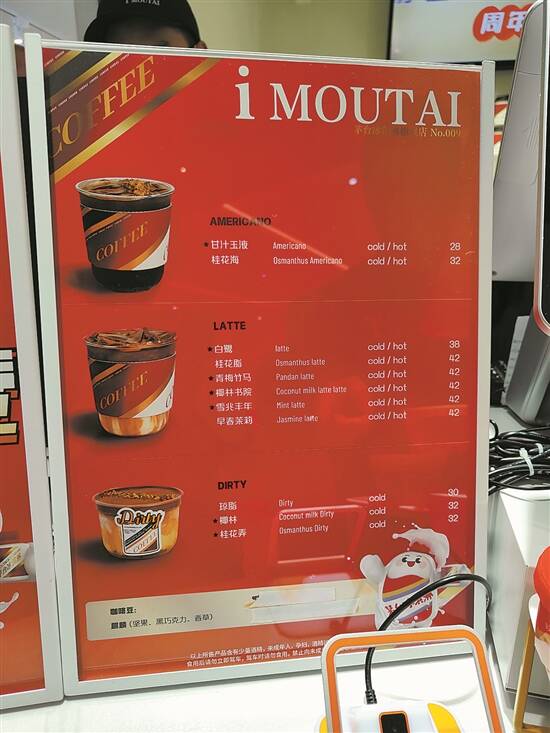 “白鹭”“桂花脂”“青梅竹马”“棚林书院”“雪兆丰年”“早春莱莉”,在饮品柜台,如果看到这些文艺范儿十足的菜单,可能消费者不知道该点什么。实际上,这是茅台在广州冰淇淋店中所销售的咖啡名称。想喝哪一款,可以看后面的英文名就好,美式(AMERICANO)拿铁(LATTECOFEE)和DIRTY(脏咖啡)。