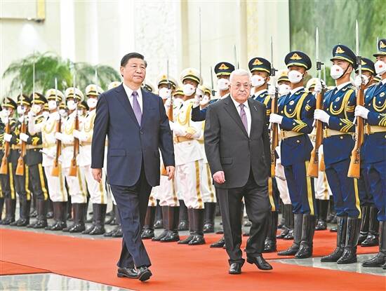 6月14日下午,国家主席习近平在北京人民大会堂同来华进行国事访问的巴勒斯坦总统阿巴斯举行会谈。会谈前,习近平在人民大会堂北大厅为阿巴斯举行欢迎仪式 新华社发