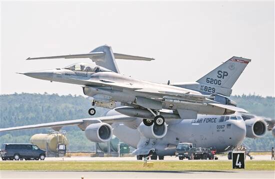 当地时间6月14日,德国莱茵兰-普法尔茨州,一架美国空军F-16战斗机在“空中卫士2023”空中军事演习期间从斯潘达勒姆空军基地起飞 图/视觉中国