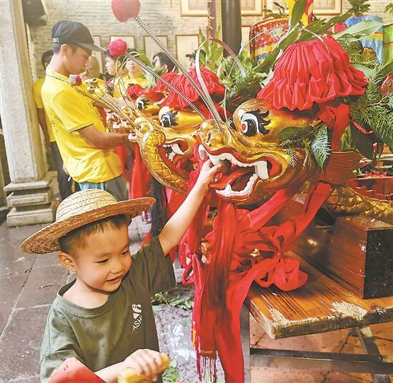 雨滴从祠堂的灰瓦滑落,发出“滴嗒滴嗒”的声响,时光也仿佛在这一刻倒流:眼睛炯炯、鳞甲闪闪的龙头令祠堂熠熠生辉,厚重的历史感扑面而来。一场淅淅沥沥的小雨,广州市级非遗文化传承人苏应昌称之为及时雨,他兴奋地说:“没有风雨,就不是我们的‘东坡号’啦!这雨是个好兆头,大吉大利!”