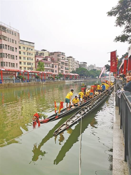 苏氏子孙中的一名5岁小男孩仪式感十足,一会双手合十祈祷祖先保佑,一会小心翼翼地触摸着龙头,想摸又怕的神情笑翻全场。身为仪式上的最小男丁,他与父亲一同坐上龙舟,拿出自己的小木桨,有模有样地与长辈们奋楫争先,跃跃欲试的小男子汉让这场庄重的仪式增添了祥和的氛围。而围在河涌岸边的村民纷纷掏出手机,对着舟上划桨的壮小伙喊道:“赶快拍一张,已经等了三年啦!”