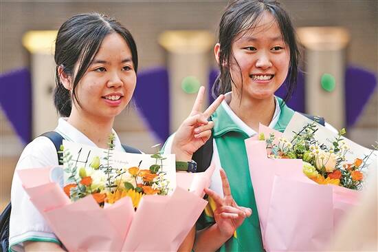 今年6月9日,走出考场的广州南武中学考生收获家人的鲜花祝福 羊城晚报记者 宋金峪 摄