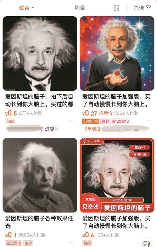 “拍下后自动长到你的脑子上,买过的都说好。”近日,某电商平台上,一款名为“爱因斯坦的脑子”的商品热销,不少店铺在售,价格从0.1元到1元不等,有商家月销上万份。